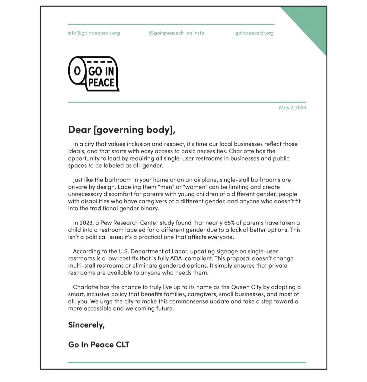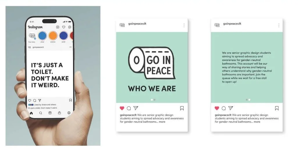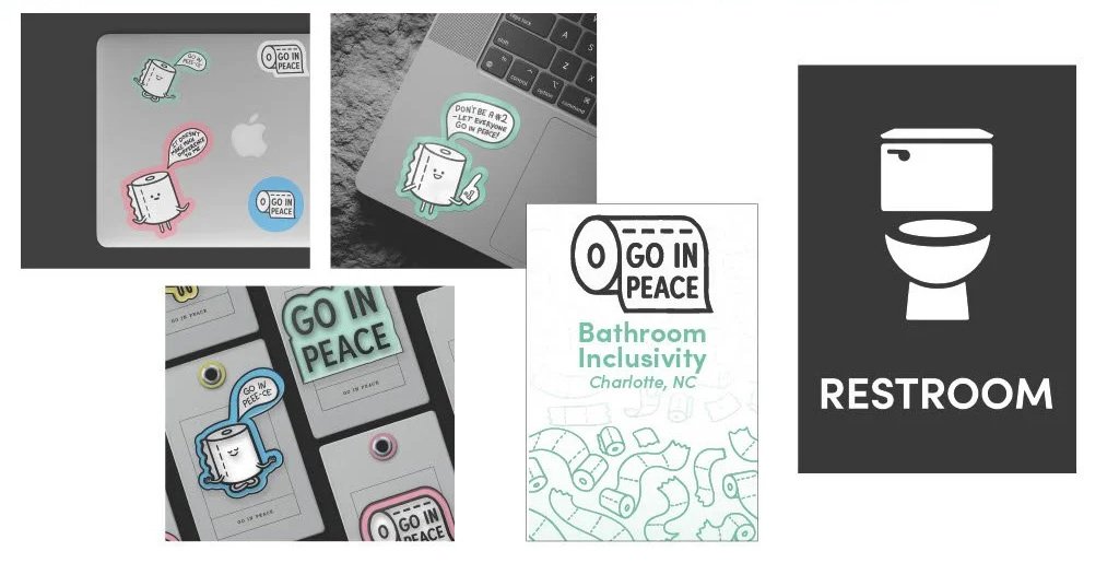 Go In Peace is a bathroom advocacy campaign encouraging small businesses, county government, and the population of Charlotte, NC to promote single-room, all-gender bathrooms as a necessary part of bathroom equality. Go In Peace is designed to bring awareness to this serious issue through the use of lighthearted, approachable visuals and humorous, succinct copy. Even simple changes such as a sign on the door can make a huge difference for single parents, people with disabilities, and the LGBTQIA+ community. Through education, support, and action, we believe that one day, everyone will be able to Go In Peace.