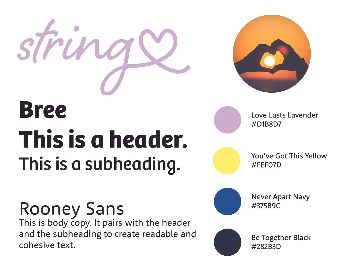 String was inspired by the concept of the invisible string, connecting us all, no matter how long it has been or how far apart. That feeling of togetherness was the main goal behind the brand. I crafted String to have a soft and approachable look and feel. String believes in the equal importance of all types of personal relationships, so the colors and branding were careful not to denote any one sort of experience.