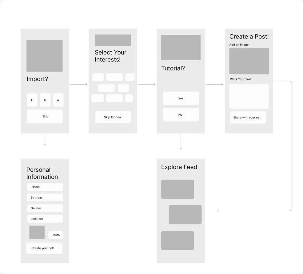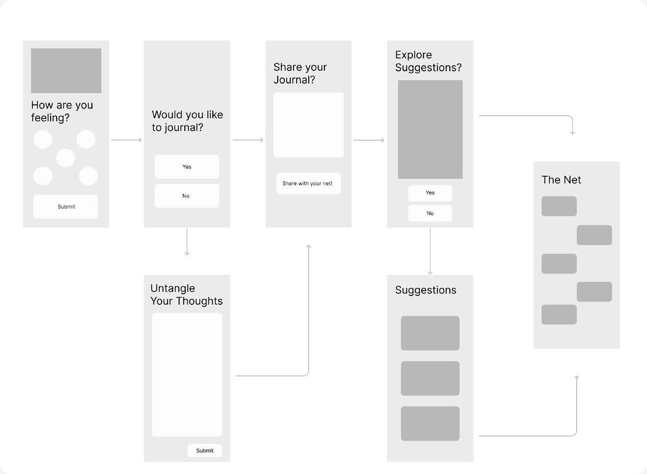 The user flows served as my starting point for designing the wireframes for my key flows. These wireframes began as rough, low-fidelity sketches on paper, before graduating to mid-fidelity workups on Figma.