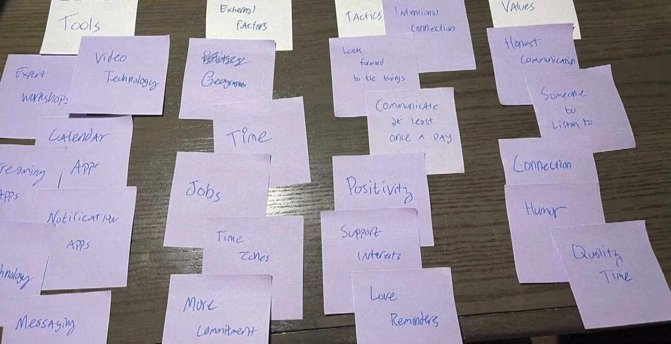 Next, I moved into in-depth user interviews. I interviewed four participants, each one having passed a screener survey to determine their eligibility. I selectively chose participants with diverse experiences with long-distance relationships in order to ensure that a variety of viewpoints were accounted for.